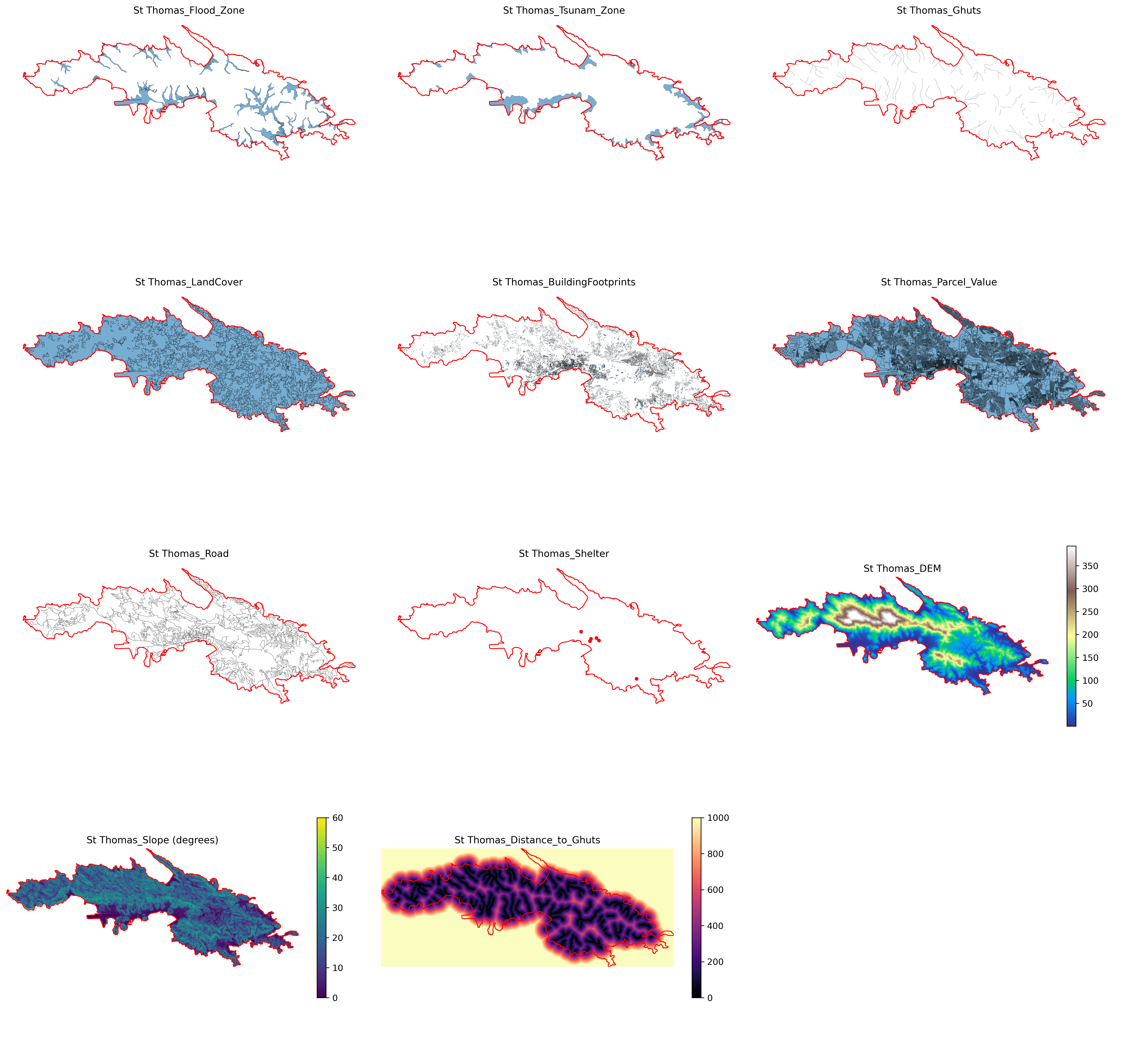 This project uses the following datasets, all clipped to the administrative boundary of St. Thomas, USVI. Foundational spatial datasets, including historical flood zones, tsunami hazard zones, land cover, ghut (drainage channel) networks, designated emergency shelters, and administrative boundaries, were obtained from the USVI Open Data Portal (https://usvi-open-data-portal-upenn.hub.arcgis.com/ ). These layers provide essential contextual information on flooding hazards, drainage infrastructure, and critical facilities. Building footprint and parcel data, provided by the local government, contain housing and land value information used to identify residential buildings and analyze form and density in Python.Road networks data were derived using Pandana’s OpenStreetMap interface in Python.