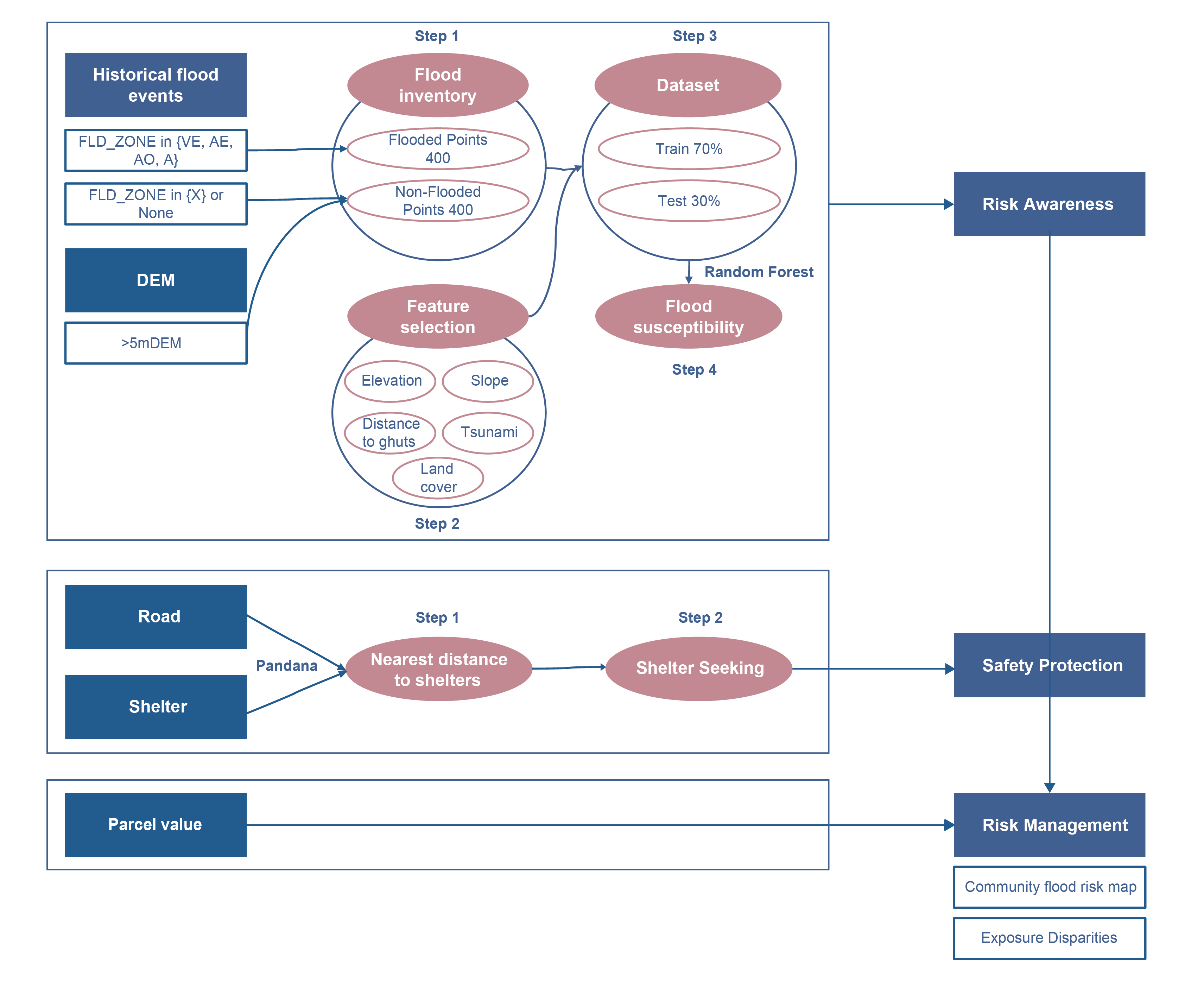 Finally, parcel-value information is integrated with flood susceptibility and shelter access to assess risk management needs. This combined analysis identifies communities facing compound vulnerabilities and informs the development of community flood-risk maps and exposure-disparity assessments.